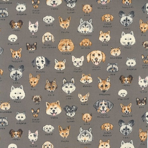 The dog heads are 3/4 to 1 inch wide and tall. There are about 30 different types of dogs represented in the print repeat. There is small text in Japanese under each head, presumably the name of the type of dog!