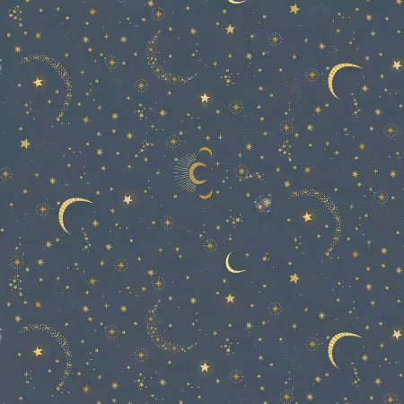 This enchanting fabric features a celestial design with a deep charcoal background, adorned with golden stars, crescent moons, and radiant suns. The pattern evokes a night sky filled with twinkling stars and celestial bodies, creating a magical and serene atmosphere perfect for crafting projects that need a touch of the cosmos. Whether for fashion, home decor, or quilting, this fabric brings a dreamy, starry night to life.